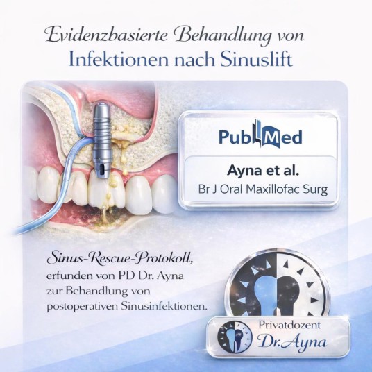 In der Studie von Dr. M. Ayna et al. wird eine minimalinvasive und praxisnahe Technik zur erfolgreichen Behandlung postoperativer Sinusinfektionen beschrieben – mit dem Ziel, Implantate zu erhalten und aufwendige Revisionsoperationen zu vermeiden.